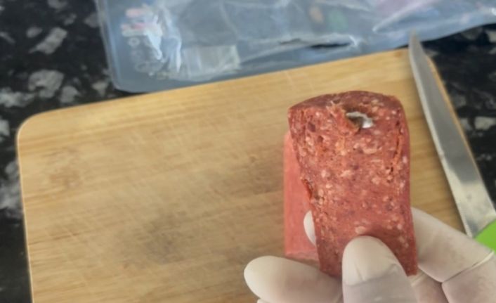 Aldığı sucuğu doğramak isteyen vatandaş, bıçağının takılmasıyla şüphelendi ve dikkatli incelediğinde sucuk içerisinde metal görünümlü bir cisimle karşılaştı.