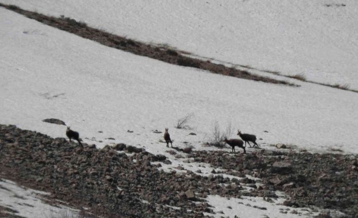 Erzincan’da 3 bin 300 rakımlı Munzur Dağı’nda, şamua cinsi olarak bilinen çengel boynuzlu dağ keçileri, sürü halinde görüntülendi.