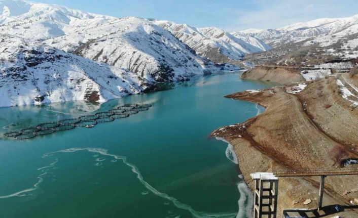Yaz mevsiminde yaklaşık 48 bin dekarlık tarım arazisini sulamak için kullanılan, aynı zamanda kafes balıkçılığı da yapılan barajda, balık kafesleri buz kütlesinin altında kaldı.
