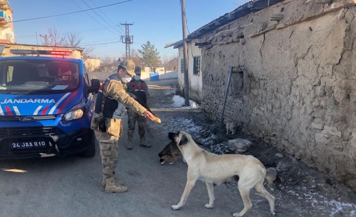 Erzincan’ın Çayırlı ilçesinde jandarma ekipleri, sokak hayvanlarına mama ve su desteğinde bulundu.