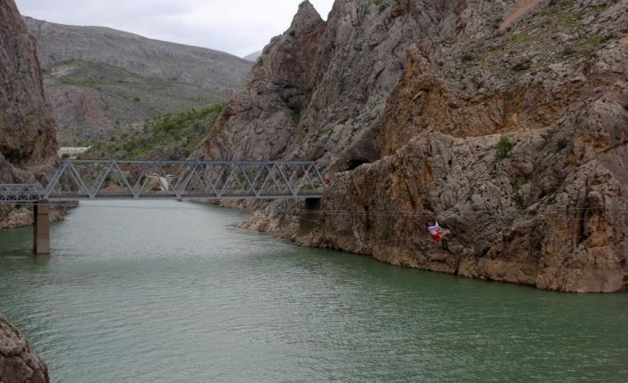 ERZİNCAN'IN KEMALİYE İLÇESİNDE BULUNAN DÜNYANIN İKİNCİ BÜYÜK KANYONU KARANLIK KANYON'DA KURULAN ZİPLİNE HATTI ADRENALİN TUTKUNLARININ İLGİSİNİ GÖRÜYOR