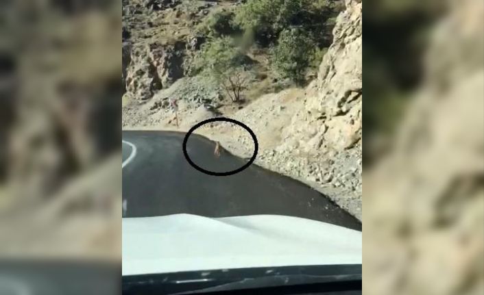 Erzincan’ın Kemaliye ilçesinde karayoluna inen kurt, otomobille seyir halindeki vatandaşların cep telefonu kamerasıyla görüntülendi.