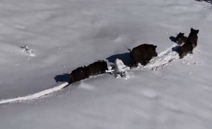 Drone kamerasına yansıyan görüntülerde, yaban domuzlarının kalın kar örtüsü üzerinde koşarak ilerlediği, zaman zaman duraksadığı ve yön değiştirerek birlikte hareket ettiği görüldü. Karla kaplı arazide uyum içinde hareket eden sürü, bir süre sonra dağlık alana doğru yönelerek gözden kayboldu.