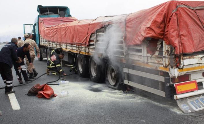 Erzincan’da lastiklerinde yangın çıkan tıra itfaiye ekipleri müdahale etti.