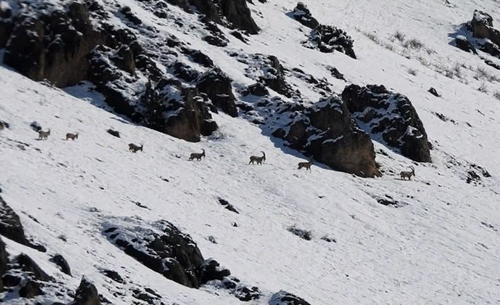 Munzur Dağları’nda etkili olan yoğun kar yağışının ardından yaban keçileri zorlu doğa koşullarında havadan görüntülendi.