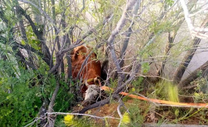 Erzincan’da nehir kıyısına düşen inek, itfaiye ekibince kurtarıldı.