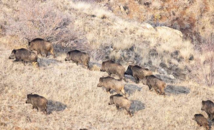 Erzincan’da popülasyonu hızla artan ve çiftçilerin mahsullerine zarar verdiği için dert yakındıkları domuz sürüsü havadan dron ile karadan da cep telefonu kamerasıyla görüntülendi.
