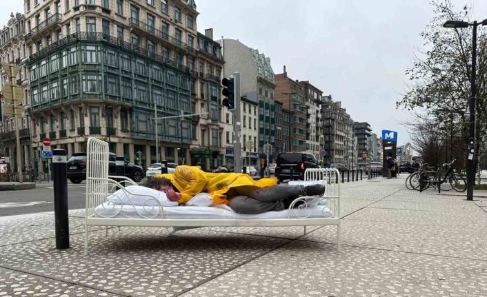 Göçmenlerin geçici barınma şartlarını simgeleyen metal karyolayı Brüksel Kuzey Tren İstasyonu’ndan Rogier Meydanı’na kadar sırtında taşıyan Kavukcu, performans sırasında karyolayı zaman zaman sürükleyerek ilerledi.