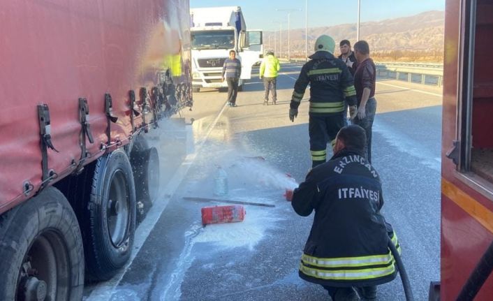 Erzincan’da seyir halindeki tırın lastiğinde çıkan yangın, itfaiye ekiplerinin müdahalesi sonucu söndürüldü.