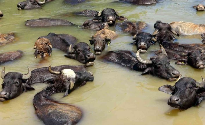 Sıcaktan bunalan mandalar nehirde serinliyor