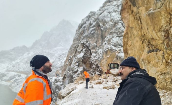 Kemaliye Taş Yolu güzergâhında, kar yağışıyla birlikte etkili olan olumsuz hava koşulları nedeniyle yamaçtan kopan kaya ve taş parçaları yol üzerine düştü.