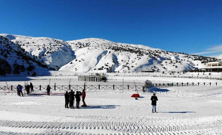 Yüzeyi buz tutan Ardıçlı Gölü mest ediyor