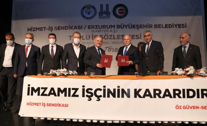 Erzurum Büyükşehir Belediyesi ve Hizmet-İş Sendikası arasında varılan mutabakatla işçi maaşlarına yüzde 14.2 oranında zam yapıldı. İbrahim Erkal Dadaş Kültür ve Sanat Merkezi’nde düzenlenen toplu iş sözleşme törenine, Erzurum Büyükşehir Belediye Başkanı Mehmet Sekmen, Hizmet-İş Sendikası Genel Başkan Vekili Hüseyin Öz, Özgüven-İş Sendikası Genel Başkanı Ömer Yılmaz, diğer yetkililer ve Büyükşehir Belediyesi çalışanları katıldı. Başkan Sekmen, törende yaptığı konuşmada, emek ve alın terinin önemine vurgu yaptı. Sekmen, “Bir husus var ki; onu asla inkâr edemez ve görmezden gelemeyiz. Bu husus ki; içinde emek var, gayret var. İçinde güç var, kuvvet var. İçinde hulusi niyetle çarpan kalpler var, samimiyet var, şükür var, hareket var, bereket var. Biz gerçekten çok şanslı bir yönetimiz. Çünkü gerek kurum içerisinde ve gerekse dışında, emekleriyle ve özverileriyle karıncaları bile kıskandıran çalışanlarımız var, kardeşlerimiz var” dedi.