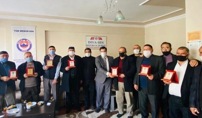Diva-Sen (Türkiye Diyanet ve Vakıf Çalışanları Sendikası) Erzurum İl Temsilciliğine davet edilen emekli din adamları için Diva-Sen Erzurum İl Temsilcisi Yusuf Kardaş, yönetim kurulu üyeleri adına hizmetlerini başarılı bir şekilde tamamlayarak emekliliği hak eden Abdulhaluk Okçi, Osman Ekinci, Muhittin Kazanç, Muammer Daştan, Mustafa Aksoy, Mehmet Savaş, Zafer Başıbüyük’e hizmetlerinden dolayı teşekkür plaketi takdim etti.