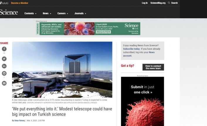 Uluslararası yayımı ve internet üzerinden giriş olanağı sayesinde geniş bir kitleye ulaşan Science AAAS, 4 Mart 2020’de yayımlanan sayısında Doğu Anadolu Gözlemevine yer verdi. Özgün bilimsel araştırmaları kendisine yayım politikası olarak belirleyen Science, aynı zamanda bilim ile ilgili haberleri, bilim politikaları hakkındaki düşünceleri ve bilim insanlarını ilgilendiren diğer konulara da dikkat çekiyor.