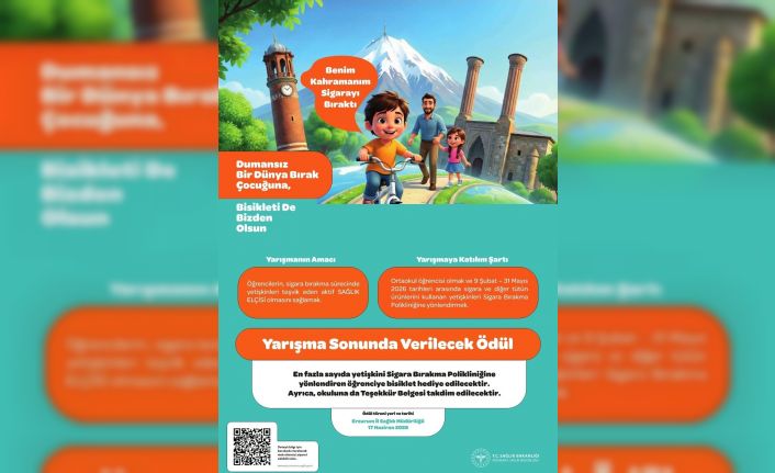 Erzurum İl Sağlık Müdürlüğü’nün hazırladığı, çocuk ve gençlerde sigara karşıtı farkındalık oluşturmak ve yetişkinleri sigarayı bırakmaya teşvik etmek amacıyla anlamlı bir yarışma hayata geçirildi. "Benim Kahramanım Sigarayı Bıraktı-Dumansız Bir Dünya Bırak, Bisikleti de Bizden Olsun" sloganıyla düzenlenen yarışma, ortaokul öğrencilerini kapsıyor.