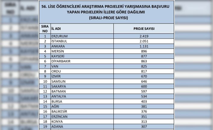 TÜBİTAK tarafından yapılan açıklama göre TÜBİTAK 2204-A 56. Lise Öğrencileri Araştırma Projeleri Yarışması’na Türkiye genelinde 22.586 başvuru yapıldı. Erzurum, 2419 başvuru ile "Türkiye Birincisi" olurken; Erzurum’u sırasıyla 2051 başvuruyla İstanbul, 1131 başvuruyla Ankara, 896 başvuruyla Mersin ve 877 başvuruyla Kayseri izledi.