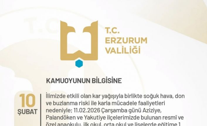 Erzurum Valiliği tarafından konu ile ilgili yapılan açıklamada, "İlimizde etkili olan kar yağışıyla birlikte soğuk hava, don ve buzlanma riski ile karla mücadele faaliyetleri nedeniyle; 11.02.2026 Çarşamba günü Aziziye, Palandöken ve Yakutiye ilçelerimizde bulunan resmî ve özel anaokulu, ilk okul, orta okul ve liselerde eğitime 1 (bir) gün süreyle ara verilmiştir. Aynı tarihte hamile ve engelli kamu personelimiz de 1(bir) gün süreyle idari izinli sayılacaktır. Vatandaşlarımızın, buzlanma ve don olaylarına karşı dikkatli olmaları; karla mücadele çalışmaları sebebiyle zorunlu olmadıkça trafiğe çıkmamaları önemle rica olunur" denildi.