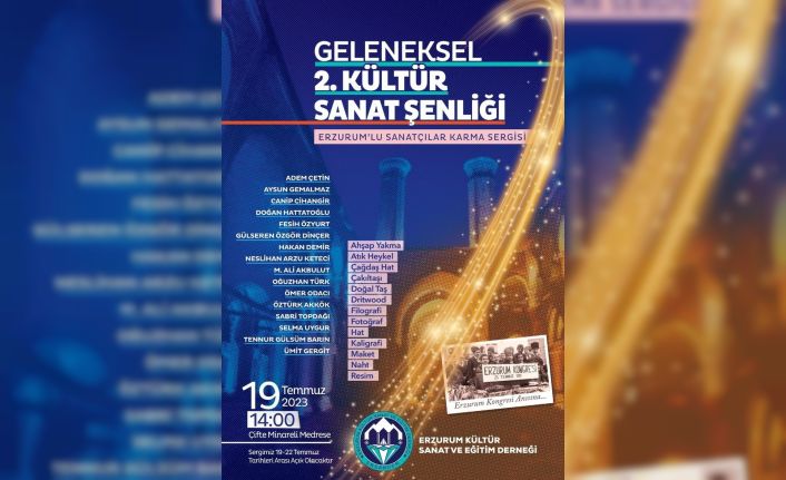 Erzurum Kongresinin 104’üncü yıldönümünde, Erzurum Kültür, Sanat ve Eğitim Derneği (ERSANDER) tarafından geleneksel olarak düzenlenen Kültür ve Sanat Şenliği’nin ikincisi, 19 Temmuz günü tarihi Çifte Minareli Medrese’de başlayacak.