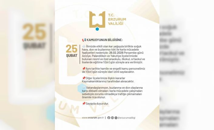 Erzurum Valisi Aydın Baruş sosyal medya hesabından yaptığı paylaşımda, "İlimizde etkili olan kar yağışıyla birlikte soğuk hava, yollardaki don ve buzlanma riski nedeniyle; 26.02.2026 Perşembe günü Aziziye, Palandöken ve Yakutiye ilçelerimizde bulunan resmî ve özel anaokulu, ilkokul, ortaokul ve liselerde eğitime bir gün süreyle ara verilmiştir. Aynı tarihte hamile ve engelli kamu personelimiz de bir gün süreyle idari izinli sayılacaktır. Diğer ilçelerimize ilişkin kararlar Kaymakamlıklarımız tarafından alınacaktır. Öğretmenlerimize ve öğrencilerimize iyi tatiller diliyorum" dedi.