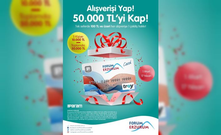 Forum Erzurum’da alışveriş yapanlar 50 bin TL değerinde Forum Erzurum Param Kart kazanma şansını yakalayacak.