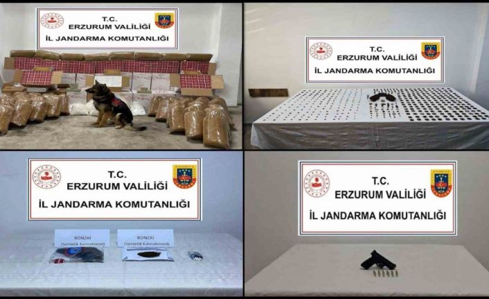 Erzurum İl Jandarma Komutanlığınca 01-31 Ocak 2025 tarihleri arasında kaçakçılık ve organize suçların önlenmesine yönelik sürdürülen çalışmalar kapsamında; 35 gram metamfetamin, 56 gram bonzai,10 gram bonzai hammaddesi,22 gram toz esrar, 4 gram eroin, 3 adet lyrıca,1 adet ruhsatsız tabanca, 2 adet tabanca şarjörü ve 21 adet fişek, 194 adet tarihi sikke, 272 adet eski eser niteliğinde süs eşyası, 3 adet dedektör, 235 kg kaçak tütün, 18 bin 192 adet sigara kağıdı, 44 bin 950 adet sigara filtresi, 456 bin 200 adet makaron, bin 376 paket sigara ele geçirildi.
