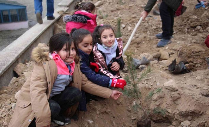 Minik yürekleri ile okullarının etrafını güzelleştirmek için kolları sıvayan öğrenciler elleriyle 150 fidanı toprakla buluşturdular.