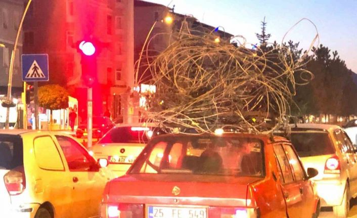 Erzurum’un Aziziye ilçesinde otomobilinin tavanına yüklediği demir yığını ile trafikte ilerleyen sürücü görenleri hayrete düşürdü.