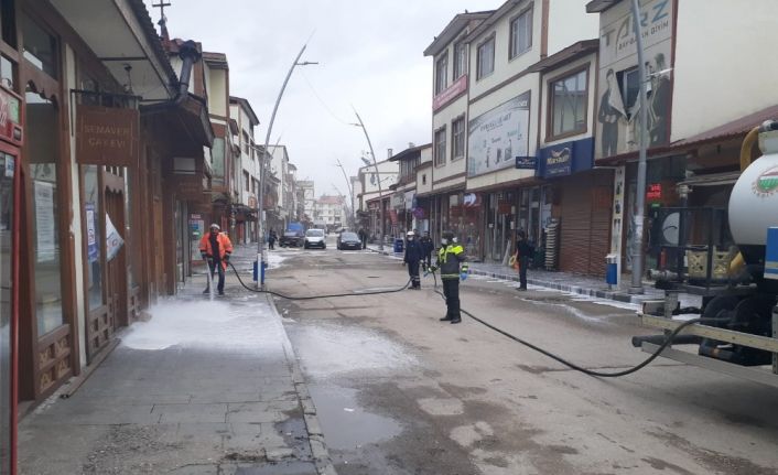 Pasinler Belediyesi tarafından ilçe merkezinde cadde ve kaldırımlar dezenfekte edilerek köpüklü suyla yıkandı.