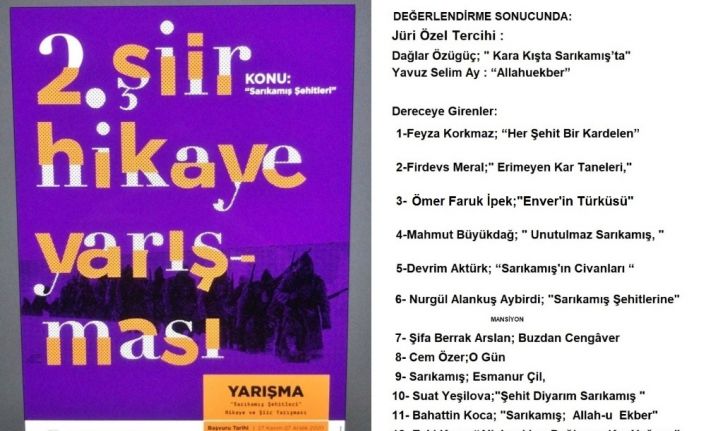 Atatürk Üniversitesi ODAK (Orta Doğu ve Orta Asya-Kafkaslar Araştırma ve Uygulama Merkezi) araştırma merkezinin tertiplediği yarışmaya 117 şiir gönderildi. Değerlendirmeyi yapan Jüri üyeleri birbirinden zengin içerikteki şiirleri seçmede zorlandılar. Şair Dağlar Özügüç ve Yavuz Selim Ay’ın jüri olduğu programda ‘Her şehit bir kardelen’ şiiriyle Feyza Korkmaz birinci oldu. Firdevs Meral ikinci olurken Ömer Faruk İpek ise üçüncü sırada yer aldı. Sarıkamış’ta önümüzdeki yıllarda da devam edeceğinin belirtildiği yarışmada derece alanlara şair Gürsoy Solmaz’ın kitapları hediye edildi.Sarıkamış şehitleri şiir yarışması sonuçları belli oldu
