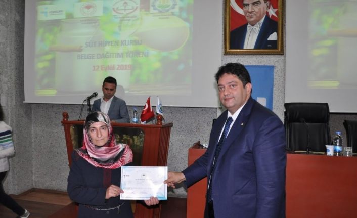 Tarım Projeleri Protokolü çerçevesinde kadın çiftçilere yönelik Süt Hijyeni-Sterilizer Makinesi Operatörü (Süthane-Mandıra) Eğitimi protokolü kapsamında düzenlenen eğitimler sonucunda başarılı olan kadın çiftçilere başarı belgeleri düzenlenen törenle takdim edildi.