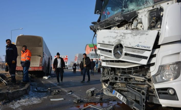 Erzurum’da dökme çimento tankeri ile yolcu otobüsünün çarpışması sonucu meydana gelen trafik kazasında araçlarda maddi hasar oluşurken, şans eseri yaralanan olmadı.