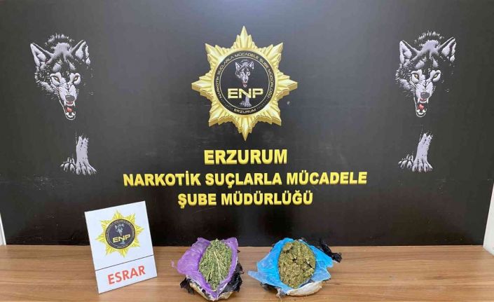 Erzurum-Erzincan karayolu üzerinde batı illerine uyuşturucu madde nakli yapan şahıslara yönelik yapılan şüpheli araç ve şüpheli şahıs analiz çalışmalarına istinaden Kahramanmaraş-Hopa seferini yapan yolcu otobüsü durduruldu. Yapılan kontroller esnasında otobüsün bagaj bölümünde bulunan valize narkotik madde arama köpeği Eris’in tepki vermesi üzerine yapılan aramada 2 parça halinde 1 kilo 840 gram esrar maddesi ele geçirildi.