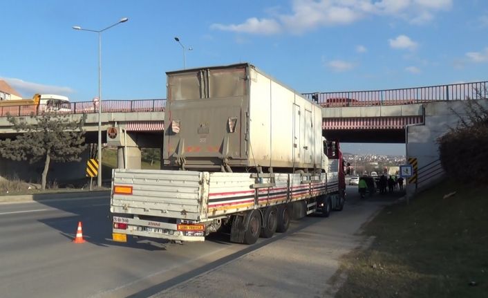 Olay dün akşamüzeri meydana geldi. Bursa istikametinden Ankara istikametine doğru giden ve dorsesinde kamyon taşıyan T.B. yönetimindeki 42 YV 130 plakalı tır çevre yolu üzerinde bulunan alt geçitten yükünün yüksekliği alt geçidin yüksekliğinden 10 santim fazla olması nedeniyle yolda takılı kaldı. Yoğun trafikte ilerleyemeyen ve duraksayan tırı son anda fark eden 26 GS 455 plakalı otomobilin sürücüsü M.U., önce tırın tamponuna sonra ise 26 E 0594 plakalı araca çarptı. Araç içerisinde çocukları ve eşi için oldukça endişelendiği gözlenen M.U., bir süre olayın şokunu üzerinden atamadı. Olay sonrası zaman zaman iki taraf sinirlerine bir süre hâkim olamadı. Olayda kimse yara almazken polis ekiplerinin incelemelerinin ardından kusurlu bulunan tır şoförü T.B.’ye işlem yapıldı. Yol kazaya karışan sürücülerin işlemlerinin ardından yeniden trafiğe açıldı.Alt geçide sığmayan tır kazaya sebebiyet verdi