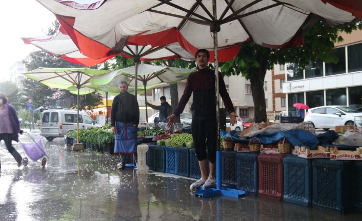 Meteoroloji 3. Bölge Müdürlüğünün yaptığı yoğun yağış uyarılarının ardından bugün Eskişehir genelinde etkili olan kuvvetli yağmur, pazar esnafını da kötü etkiledi. Ulus caddesi üzerine kurulan Cuma Pazarı’nda yağışın etkisiyle rögarlar tıkandı, irili ufaklı su birikintileri oluştu. Pazara gelen vatandaşlar bir anda dağılırken pazar esnafı zor anlar yaşadı. Bazı esnaf kendince önlemler almayı denese de sadece mallarını koruyabildi. Çoğu pazar esnafının ise ayakkabılarını çıkarıp terlikleriyle su birikintisinin içinde satış yapmaya çalıştığı görüldü.