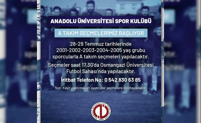 Anadolu Üniversitesi Spor Kulübü, Futbol A takım seçmelerinin yapılacağını duyurdu. Mavi-beyazlı kulüpten konuyla ilgili yapılan paylaşımda, 28-29 Temmuz tarihlerinde 2001-2002-2003-2004-2005 yılı doğumlu yaş grubu sporcularla A takım seçmeleri yapılacağı bildirildi. Seçmelerin saat 17.30’da Osmangazi Üniversitesi Futbol Sahası’nda gerçekleştirileceği belirtildi.