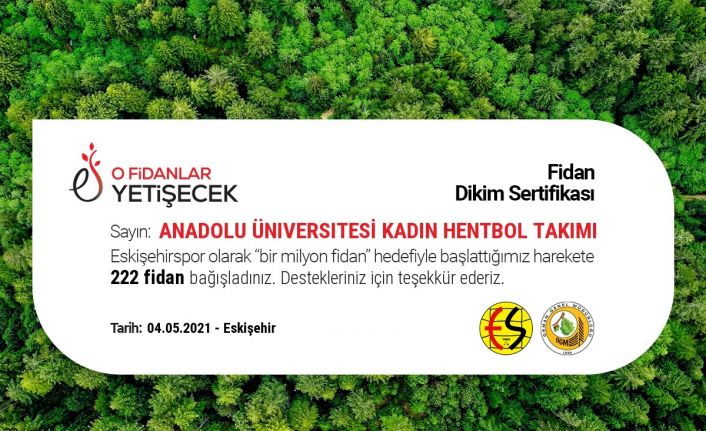 Eskişehirspor’un Eskişehir Orman Bölge Müdürlüğü iş birliği ile başlattığı 1 milyon fidan kampanyasına bağışlanan fidan sayısı 18 bini geçerken, kampanyaya spor camiasından ilk önemli destek Anadolu Üniversitesi Kadın Hentbol Takımı oyuncularından geldi. Eskişehir’i süper ligde temsil eden Anadolu Üniversitesi Kadın Hentbol Takımı oyuncuları, Eskişehir ve Eskişehirspor’un geleceğine nefes olacak anlamlı kampanyaya, 222 fidan bağışı yaparak destek oldular. Spor camiası arasındaki bu dayanışmanın şehrimiz adına önemli olduğu ifade eden Anadolu Üniversitesi Kadın Hentbol Takımı oyuncuları, tüm spor camiasını da kampanyaya destek olmaya davet ettiler.Anadolu Üniversitesinden Eskişehirspor’a bir önemli destek daha