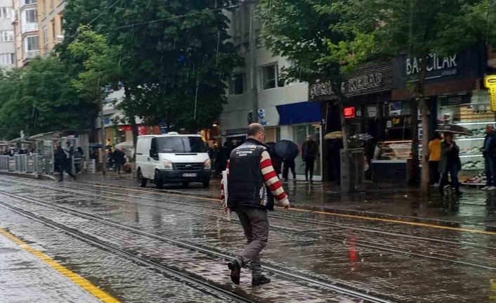 Eskişehir’de aniden bastıran kısa süreli sağanak yağmurdan nasıl kaçacağını bilemeyen vatandaşlar koşturarak kapalı yerlere sığınmaya çalıştı.