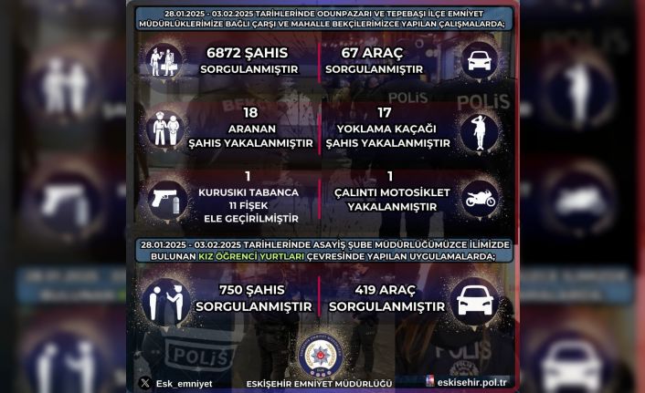 Edinilen bilgilere göre, 28 Ocak-3 Şubat 2025 tarihleri sarasında Eskişehir Emniyet Müdürlüğü’ne bağlı Odunpazarı İlçe Emniyet Müdürlüğü ve Tepebaşı İlçe Emniyet Müdürlüğü ekiplerince çalışma yapıldı. Çarşı ve mahalle bekçileri tarafından gerçekleştirilen çalışmalarda, 6 bin 872 şahıs ve 67 araç kimlik sorgusu yapıldı. Sorgulamalar sonucunda, aranan 18 şüpheli ve yoklama kaçağı 17 kişi yakalandı. Öte yandan, 1 kurusıkı tabanca, 11 fişek ve 1 çalıntı motosikletin ele geçirildiği öğrenildi.