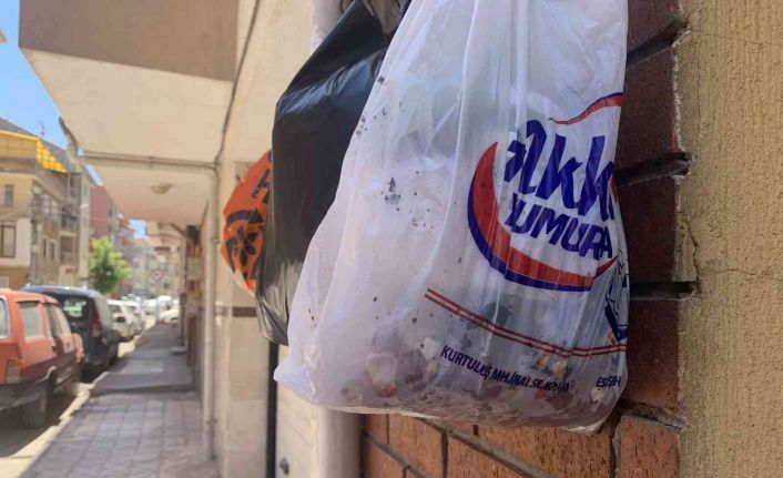 Eskişehir’de bir sokakta yaşayan vatandaşlar, konteynır olmamasından dolayı çöp poşetlerini yüksekte olan direklere ve bina duvarlarına konulan çengellere asarken, bu yolu sokak hayvanlarının atıkları dağıtmamaları için seçtiklerini belirtiyorlar.
