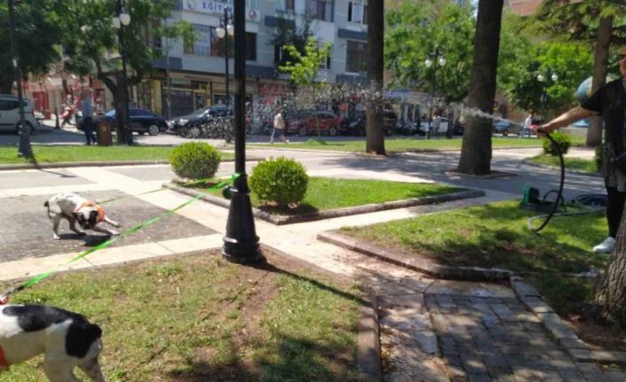 Odunpazarı İlçesinde bulunan hükümet konağının önünde yeşil alanda sıcaktan bunalan köpekleri çim sulama hortumuyla serinletirken çevrede görenleri gülümsetti. Son günlerde etkisini arttıran hava sıcaklıklarına kendi çözümünü üreten sevimli köpeklerin sahibi, dakikalarca hortumla sevimli köpeklere su tutarak zaman geçirdi. Köpekler sergiledikten sonra sahibi ile alandan ayrıldı.