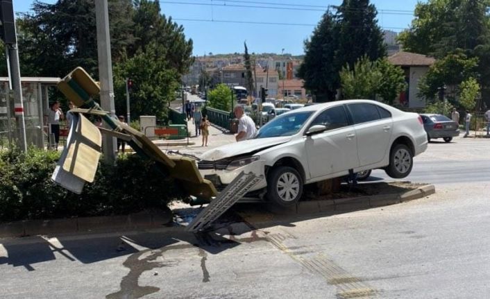 Eskişehir’de yola fırlayan çocuğa çarpmamak için ani manevra yaptığı iddia edilen otomobil, refüje çıkarak trafik levhasına çarptı.