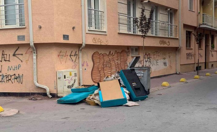 Eskişehir’de bir sokak üzerinde sıralı halde bulunan çöp konteynırlarına atılan eski ve atıl vaziyetteki eşya parçaları tüm sokağı kaplarken, ilginç görüntülerin oluşmasına da neden oldu.