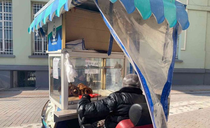 Eskişehir’de soğuk havaya karşı brandayla önlem alan simitçiler, tüm zorluklara rağmen tezgâhlarının başından ayrılmıyor.