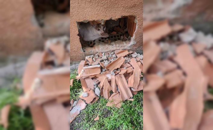 Duvarın içinde mahur kalan kedi itfaiye ekipleri tarafından kurtarıldı