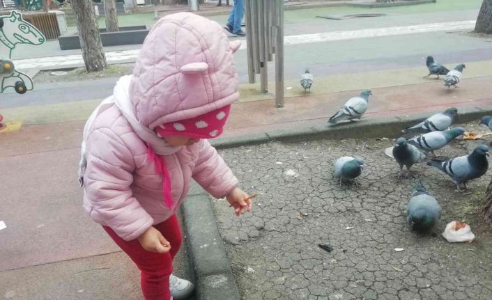Eskişehir’de ailesinin parka getirdiği minik Leyla, elindeki çubuk krakeri güvercinlerle paylaştı.