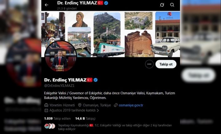 Dr. Erdinç Yılmaz, son yayınlanan Valiler Kararnamesi ile Eskişehir Valisi olarak atandı. Bugün göreve başlayan ve çiçeklerle karşılanan Vali Yılmaz, sosyal medya hesabında düzenleme yaptı. Yılmaz, hesabındaki duvar kağıdını Eskişehir’i anlatan bir resimle değiştirdi. Bu resimde şehrin simgelerinden olan Tarihi Odunpazarı Evleri, Yunus Emre, Köprübaşı Mevkisi, Sivrihisar Tarihi Saat Kulesi, E5000 Elektrikli Tren, Seyyid Battal Gazi Külliyesi, Midas Antik Kenti, Eskişehir Valiliği Binası ve Devrim Arabası yer aldı.