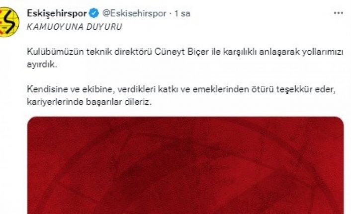 Eskişehirspor, Teknik Direktör Cüneyt Biçer ile yollarını ayırdı. 20 Temmuz tarihinde göreve başlayan teknik adam, aldığı kötü sonuçlar sonucunda yol ayrımına geldi. Kulüp yaşanan ayrılığı resmi sosyal medya hesaplarından duyurdu. Paylaşımda, “Kulübümüzün Teknik Direktörü Cüneyt Biçer ile karşılıklı anlaşarak yollarımızı ayırdık. Kendisine ve ekibine, verdikleri katkı ve emeklerinden ötürü teşekkür eder, kariyerlerinde başarılar dileriz” denildi.