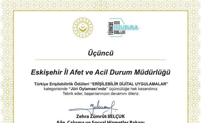Aile, Çalışma ve Sosyal Hizmetler Bakanlığı tarafından bu yıl ikincisi düzenlenen Türkiye Erişilebilirlik Ödülleri "Erişilebilir Dijital Uygulamalar" kategorisinde, Eskişehir Afet ve Acil Durum Yönetimi İl Müdürlüğü (AFAD)’ın "Afetlere Karşı Engelleri Birlikte Aşalım" projesi dereceye girerek üçüncü oldu.