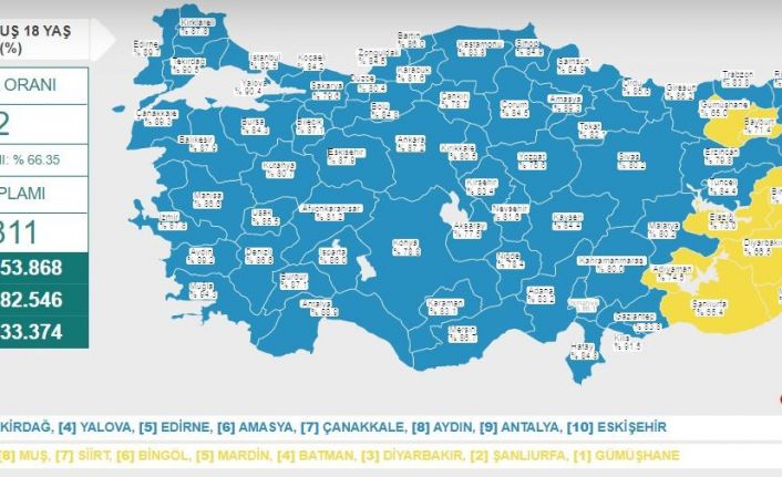 En az bir doz aşı olmuş 18 yaş ve üstü nüfus yüzdelerinin bulunduğu tabloya göre; Türkiye genelinde 1’inci doz aşı yapılma oranı yüzde 84,02, 2’nci doz aşı yapılma oranı yüzde 66,35 oldu. Tüm dozlar dâhil edildiğinde yapılan toplam aşı sayısı ise 103 milyon 526 bin 811’e ulaştı.